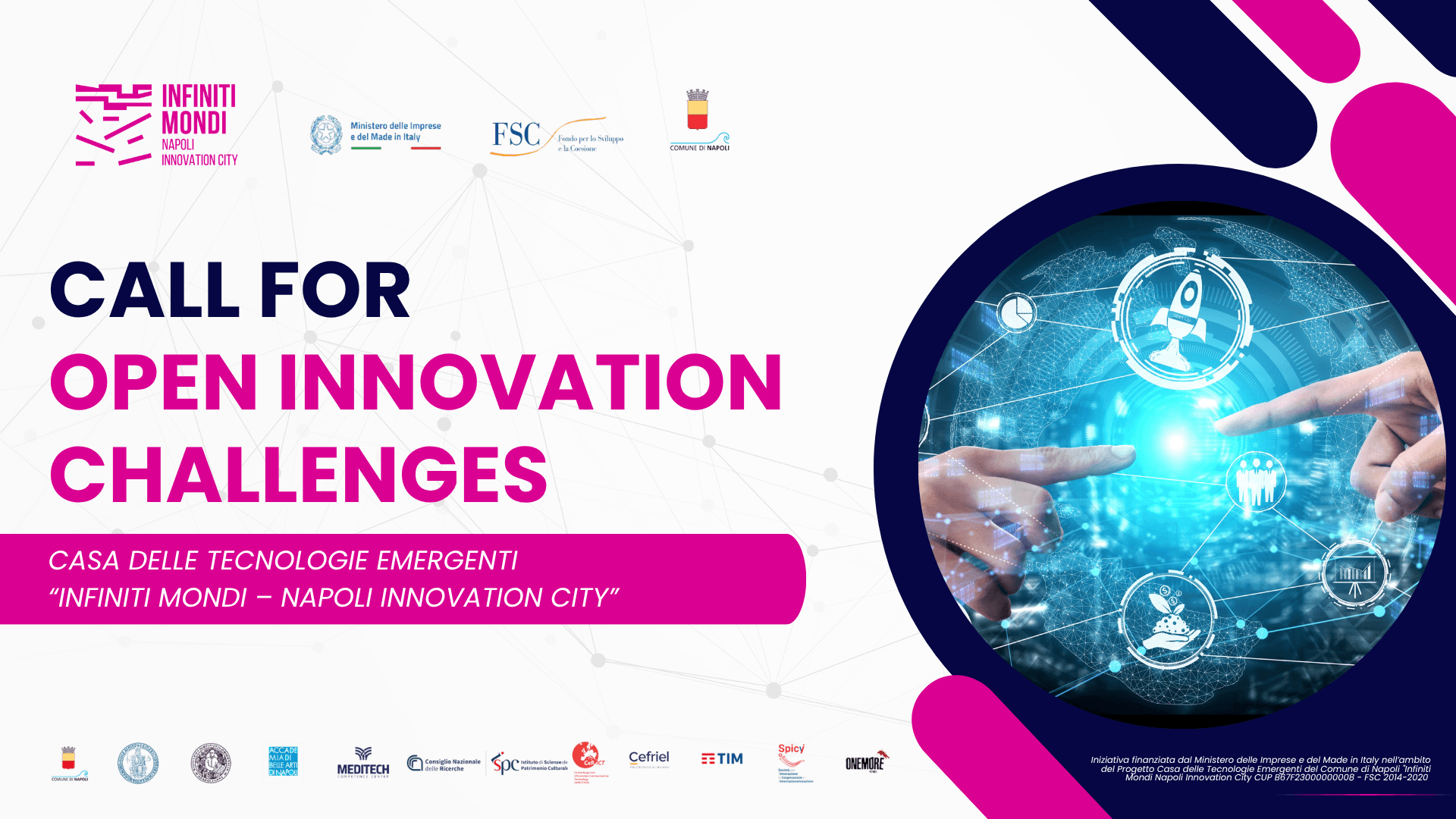 Per il progetto della Casa delle Tecnologie Emergenti, il Comune di Napoli è capofila di un partenariato che comprende le Università degli Studi di Napoli Federico II e “L’Orientale”, l’Accademia di Belle Arti di Napoli – i cui studenti hanno realizzato il logo ufficiale di “InFiniti Mondi” – il centro di innovazione digitale Cefriel del Politecnico di Milano, i centri di ricerca e innovazione MedITech 4.0, CNR – Istituto di Scienze del Patrimonio Culturale e CeRICT Scarl, nonché imprese innovative come TIM, SPICI e One More Pictures.