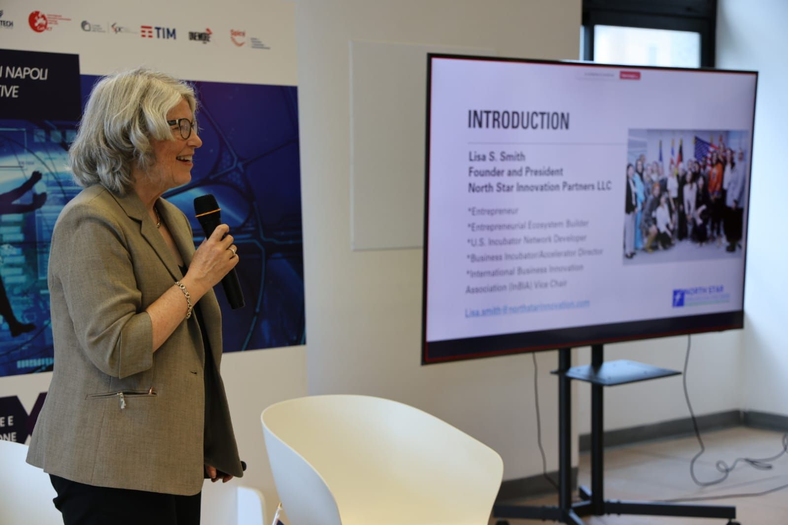 Among others, the event was attended by: 𝐄𝐫𝐢𝐜𝐚 𝐌. 𝐌𝐚𝐫𝐫𝐞𝐫𝐨, Public Affairs Officer of the US Consulate General in Naples; 𝐕𝐢𝐧𝐜𝐞𝐧𝐳𝐨 𝐋𝐢𝐩𝐚𝐫𝐝𝐢, President of SPICI; 𝐋𝐢𝐬𝐚 𝐒𝐦𝐢𝐭𝐡, Founder of NorthStar Innovation Partners (USA); 𝐌𝐚𝐣𝐚 𝐊𝐫𝐢ž𝐚𝐧, Business Angels of Slovenia; 𝐖𝐞𝐫𝐨𝐧𝐢𝐤𝐚 𝐅𝐮𝐫𝐭𝐚𝐤, CEO of Bugstruck (Poland); and other alumni of the IVLP program.
