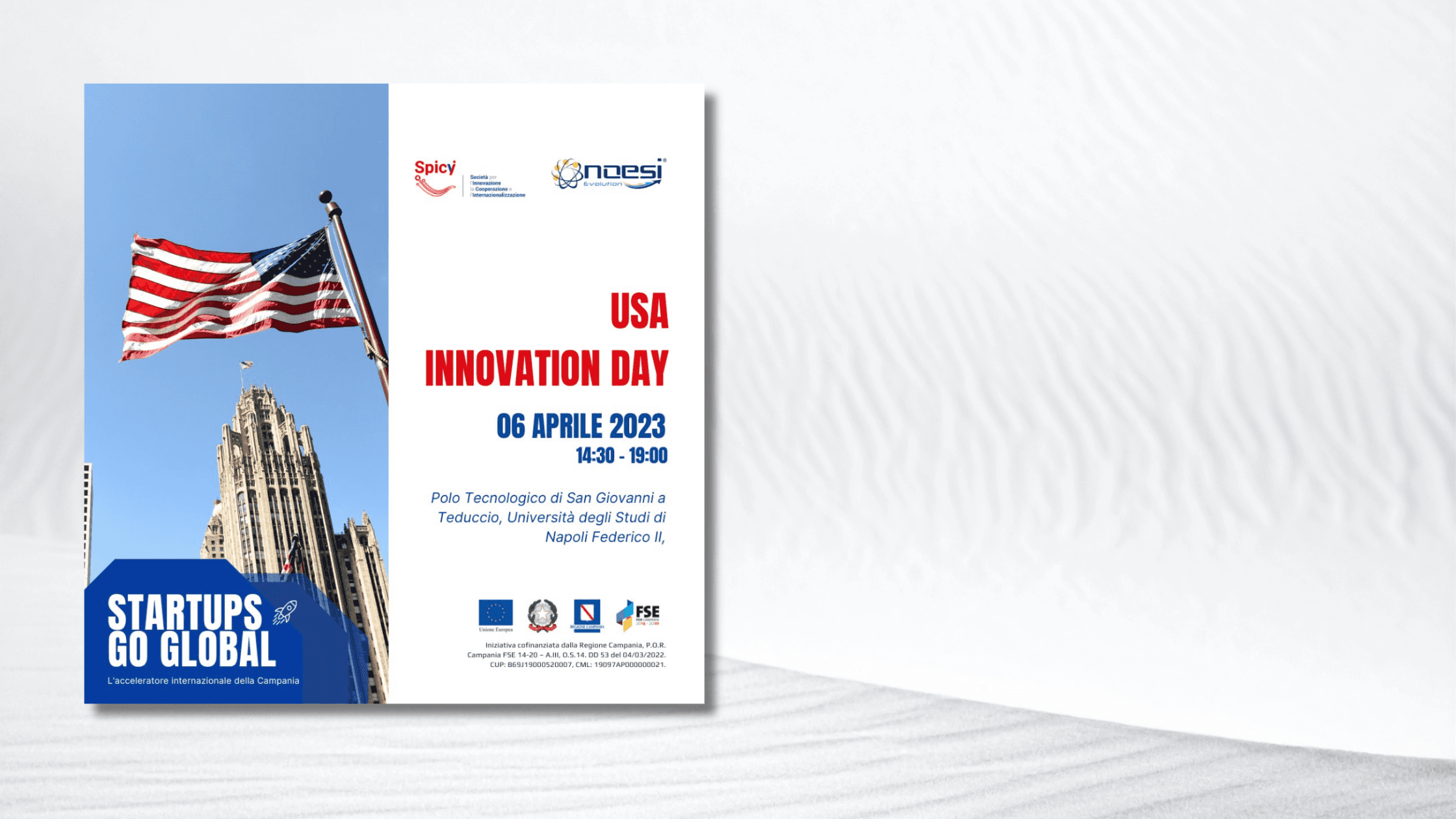 Giovedì 06 aprile, presso l’ Università degli Studi di Napoli Federico II - Polo Tecnologico di San Giovanni a Teduccio, si terrà lo "USA INNOVATION DAY" nell'ambito di Startups Go Global, il programma di accelerazione internazionale e formazione imprenditoriale promosso da SPICI Società per l'Innovazione, la Cooperazione e l'Internazionalizzazione e Noesi Evolution, finanziato dalla Regione Campania.